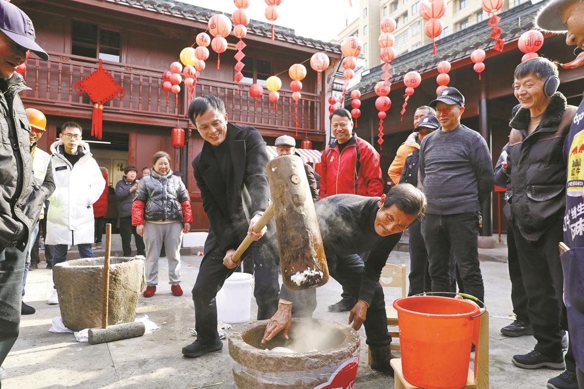 活动现场,只见唐氏宗祠门口志愿者们支着两口冒着热气的大锅,一口大锅内蒸着的是香喷喷的糯米饭,另一口锅内煮着的是热气腾腾的宁波浆板汤果。几位志愿者把蒸好的糯米饭一箩筐一箩筐地往宗祠内抬,放进一个大大的缸里。只见志愿者一个接着一个,用个大锤使劲打里面的糯米饭,另一位则用手一遍一遍地添水,周围群众的高呼呐喊声不绝于耳。“这可是阿拉宁波人过新年的传统项目,阿拉小时候经常可以看到,现在已经十多年没看到了,没想到今天在这儿又体验了一把。”一位抡大锤的居民兴奋地说道。