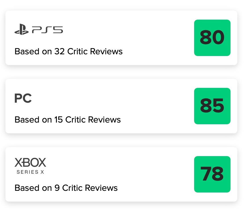 IT之家参考 Metacritic,这款游戏 PS5 版均分 80 分(32 家媒体)、PC 版 85 分(15 家媒体)、Xbox Series X 平台版本 78 分(9 家媒体)。
