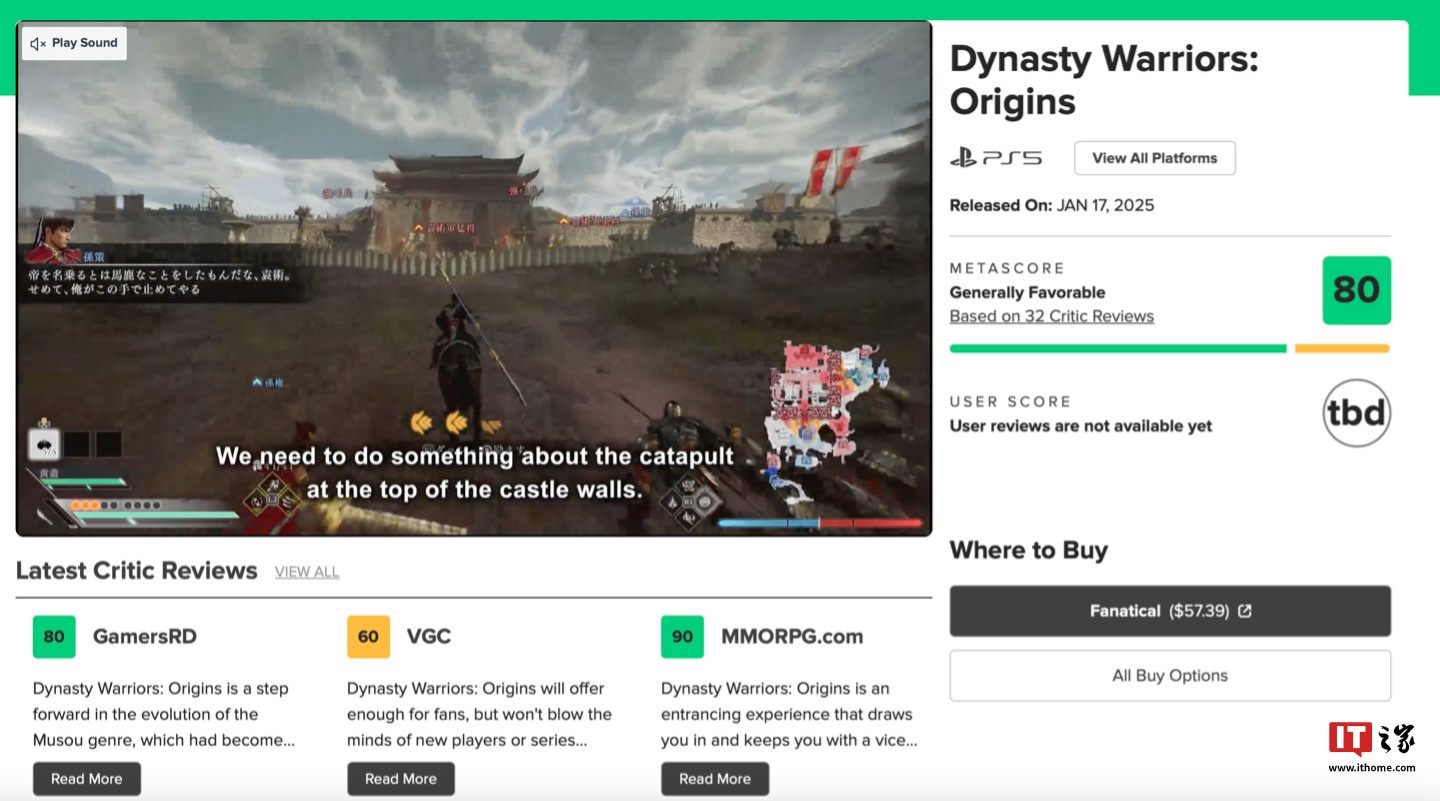 IT之家 1 月 13 日消息,KOEI TECMO GAMES(光荣特库摩)旗下《真三国无双:起源(Dynasty Warriors: Origins)》将于 1 月 17 日发售,游戏在 Steam 国区(点此访问)定价为 349 元起,目前这款游戏的全球媒体评测已解禁。